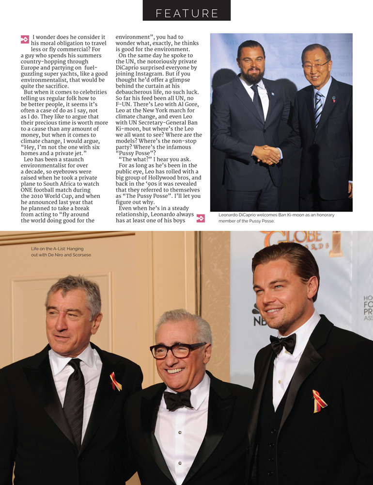 On the same day he spoke to the UN, the notoriously private DiCaprio surprised everyone by joining Instagram. But if you thought he’d offer a glimpse behind the curtain at his debaucherous life, no such luck. So far his feed has been all UN, no F-UN. There’s Leo with Al Gore, Leo at the New York march for climate change, and even Leo with UN Secretary-General Ban Ki-moon, but where’s the Leo we all want to see? Where are the models? Where’s the non-stop party? Where’s the infamous “Pussy Posse”?